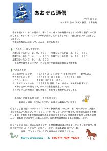 Shareあおぞら(さとやま)教室 北島由美 今年も残すところ1ヶ月余り。寒くなってきてから毎日があっという間に過ぎていく気がします。そしてインフルエンザが大流行しているようです。体調に気をつけてお過ごしください。